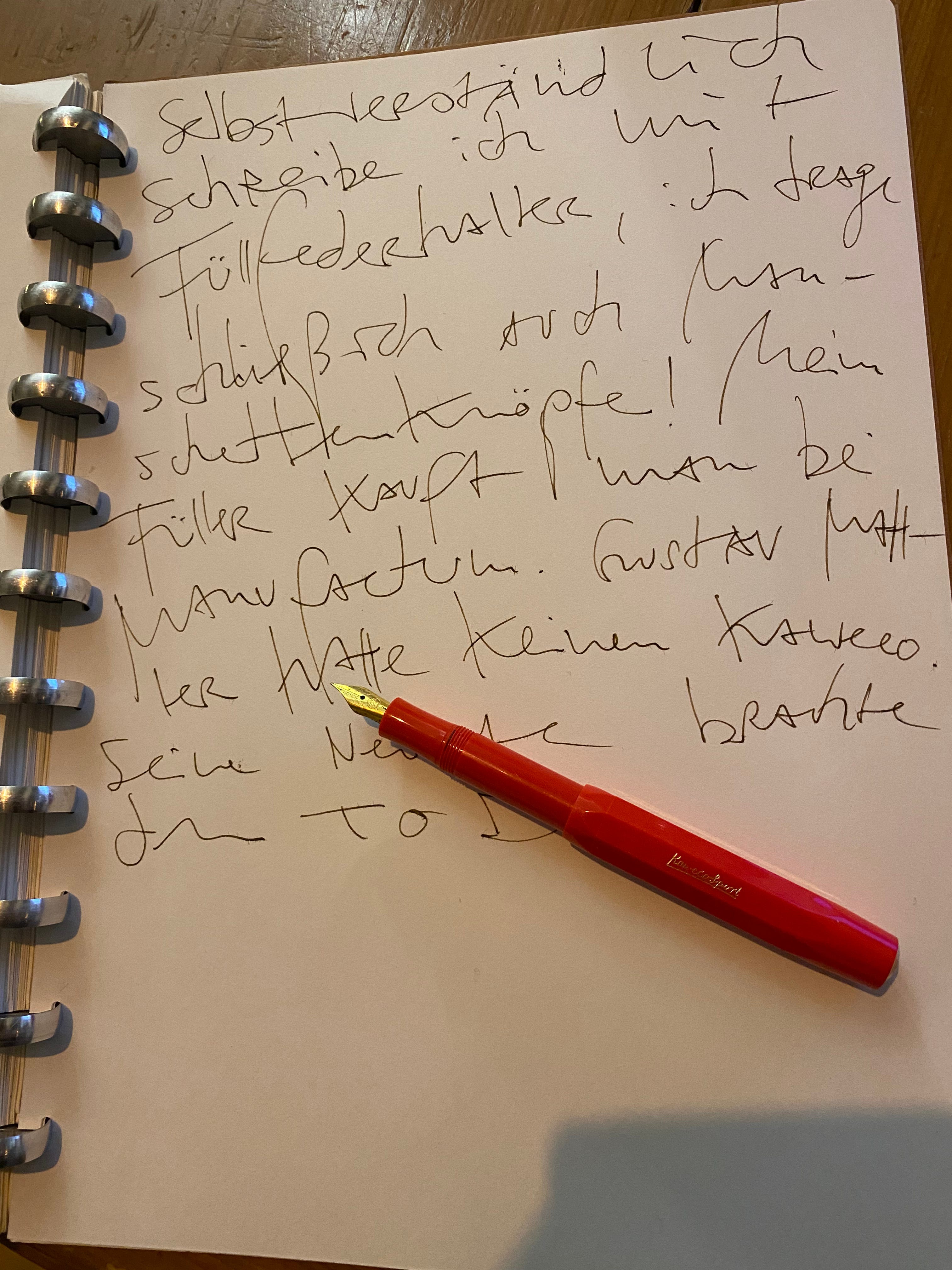 Ich schreibe selbstverständlich mit Füllfederhalter. Schließlich trage ich auch Manschettenknöpfe und bringe in die Kantine mein privates Silberbesteck und eine aufgerollte Tischdecke mit. Wenn ich mal in einer Kantine essen muss.1 Der Füller meiner Wahl ist ein historisches Modell, der Kaweco Sport von 1911.