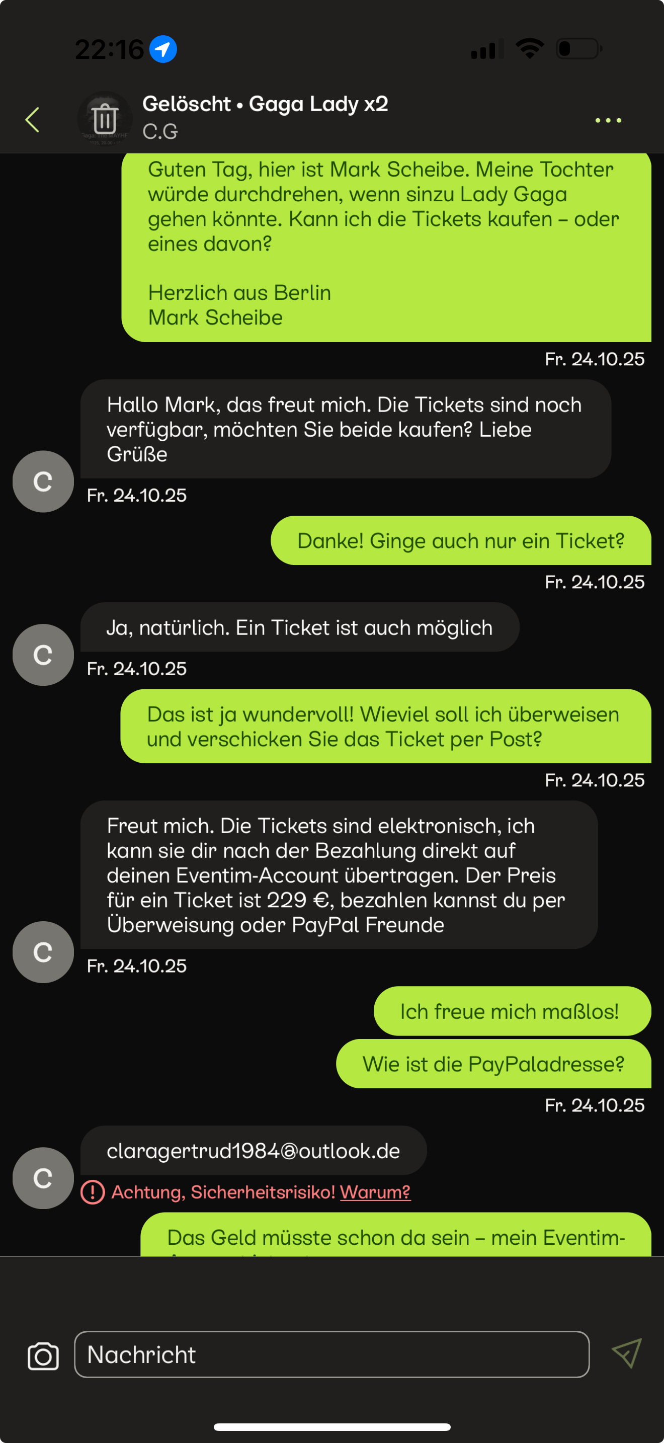 Lady Gaga! Meine Tochter ist ein Fan – mit Zehn besuchte sie ihr erstes Gaga-Konzert. Heute, vierzehn Jahre später, ist die Diva wieder in Berlin, die Tickets waren schnell verkauft. Weil ich glücklich bin, wenn meine Tochter es ist, suchte ich – und fand ein Angebot auf kleinanzeigen.de.
